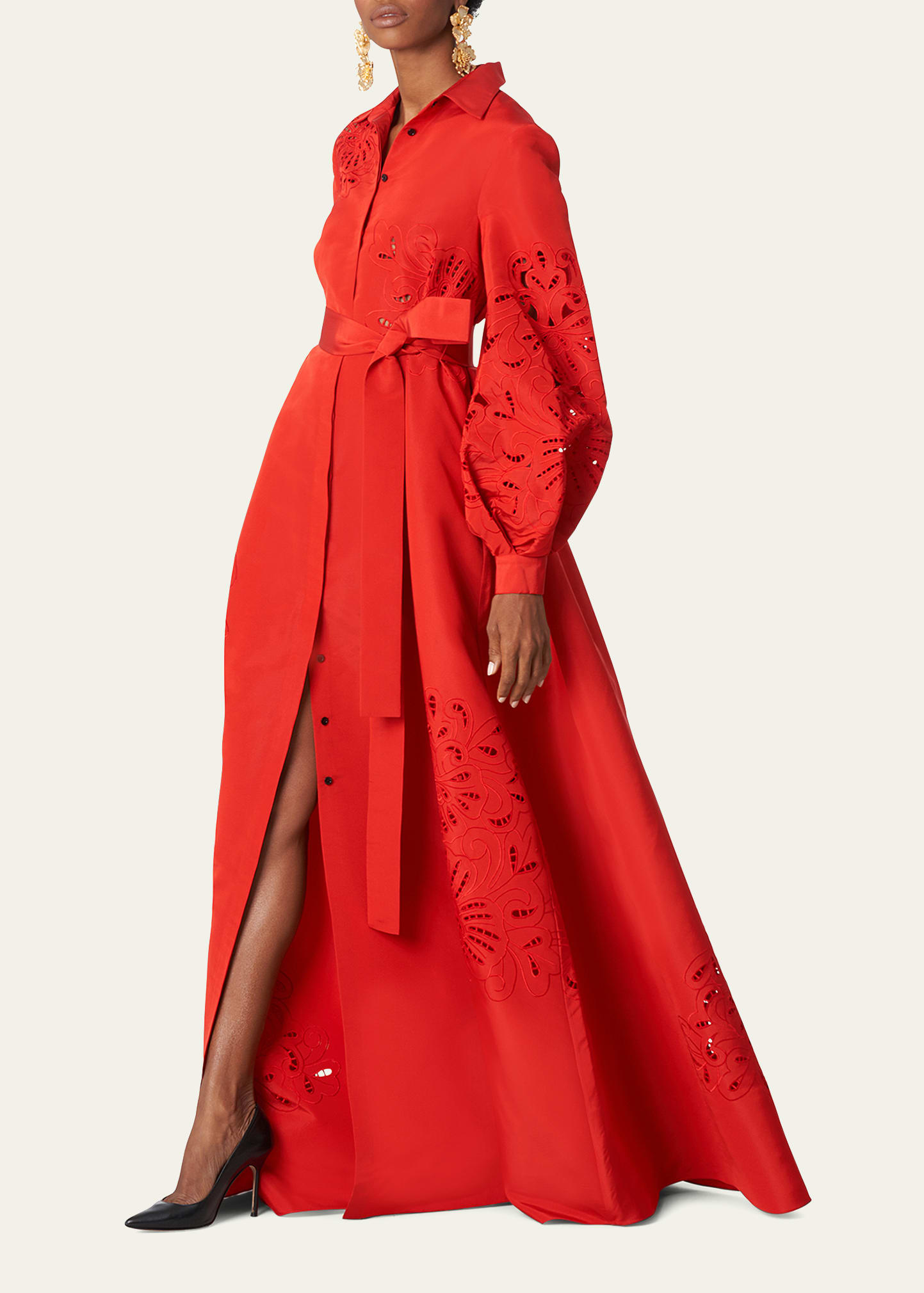 Carolina Herrera Eyelet Embroidered Shirt Gown w/ Waist Tie, Red, Women's, 4, Evening Formal Gala Gowns Mother of The Bride Groom Evening Gowns